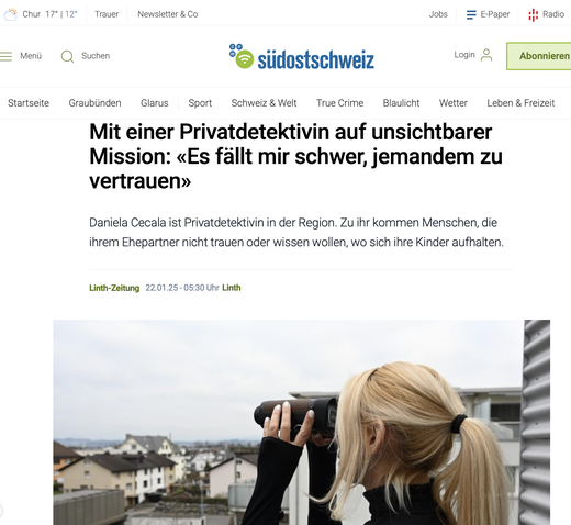 Der Südostschweiz-Artikel gewährt einen tiefen Einblick in meine Arbeit als Detektivin: Beobachtungen, Recherche, psychologische Strategien – und die